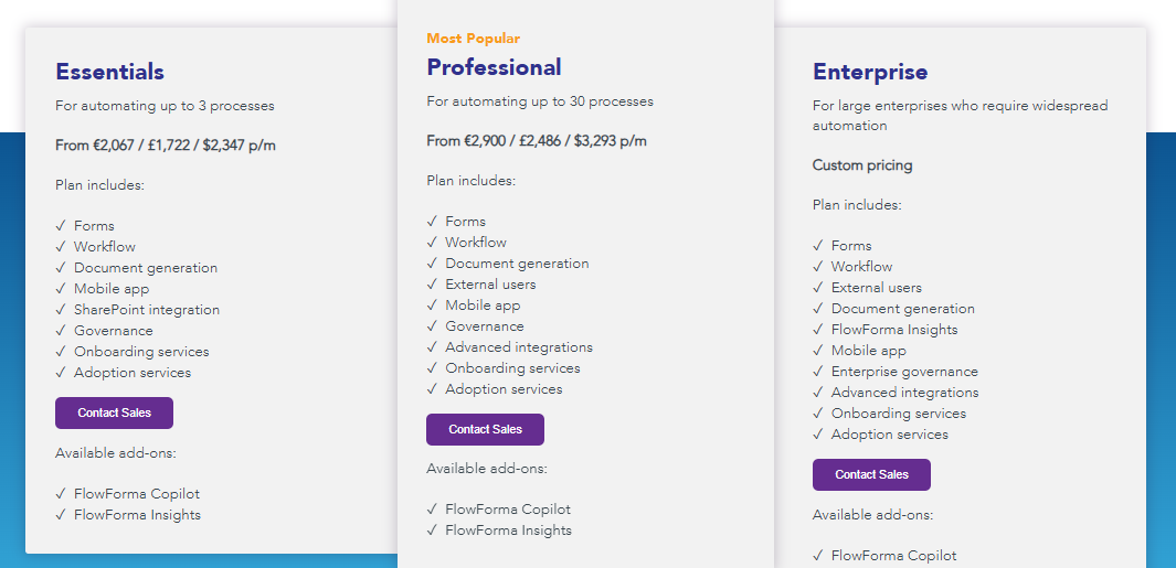 FlowForma pricing is transparent with no hidden costs. The pricing is based off how many users you have and there are different packages depending on what your requirements are and features you will require.