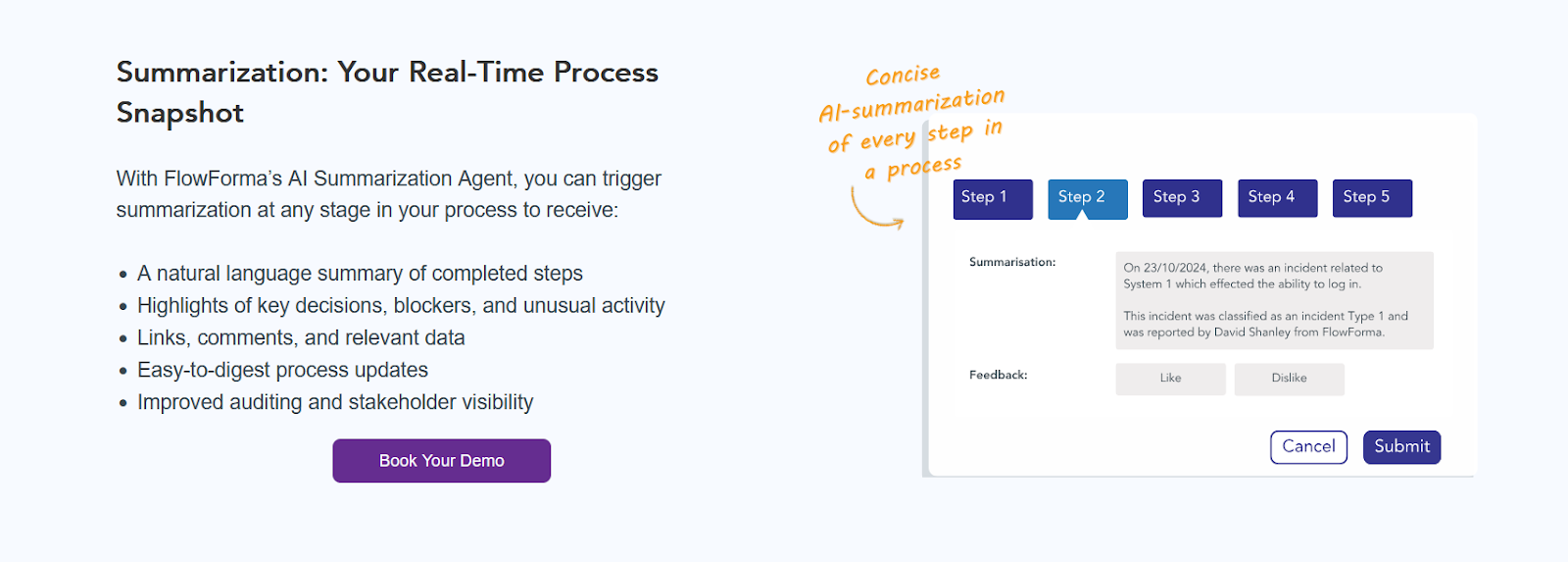 - Summarization: Generate clear, natural-language summaries of workflow progress. Teams can instantly produce reports summarizing approvals, decisions, and anomalies—ideal for audits or stakeholder updates.